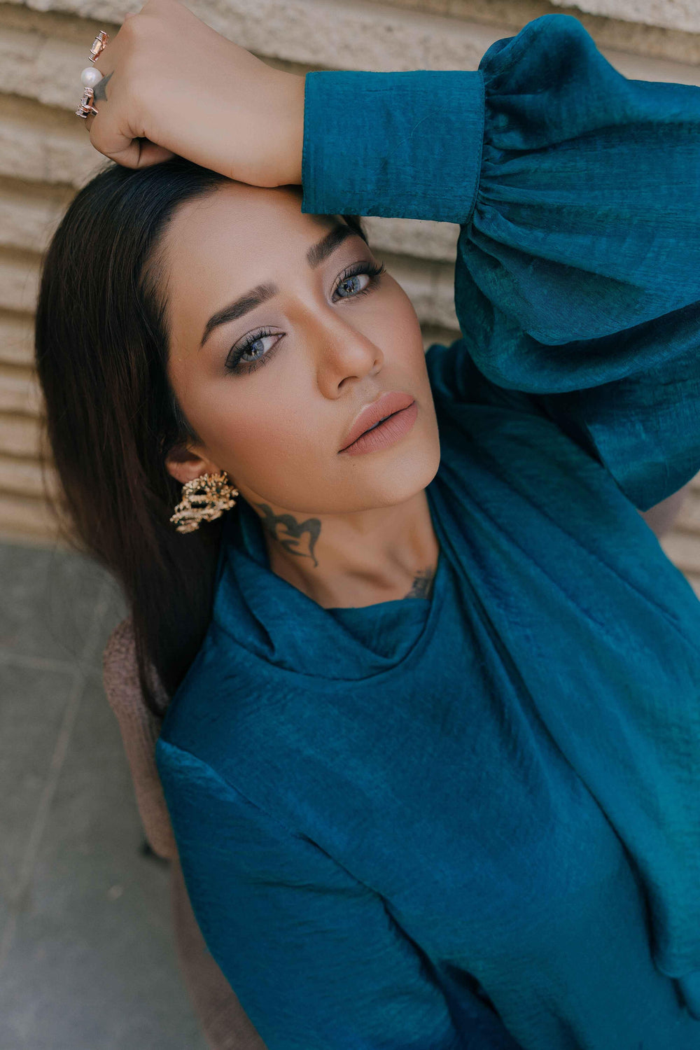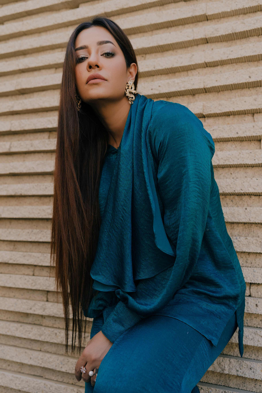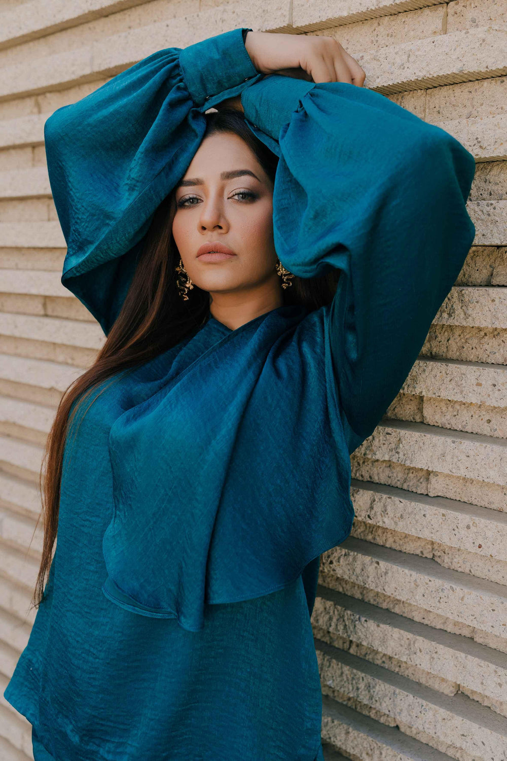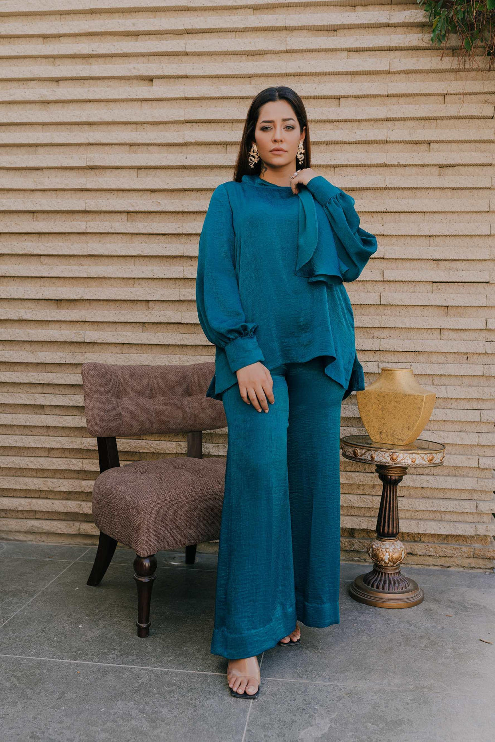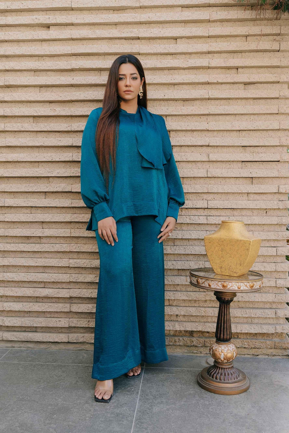 Shirt with puffed sleeves details and attached stole paired up with flaired pants.