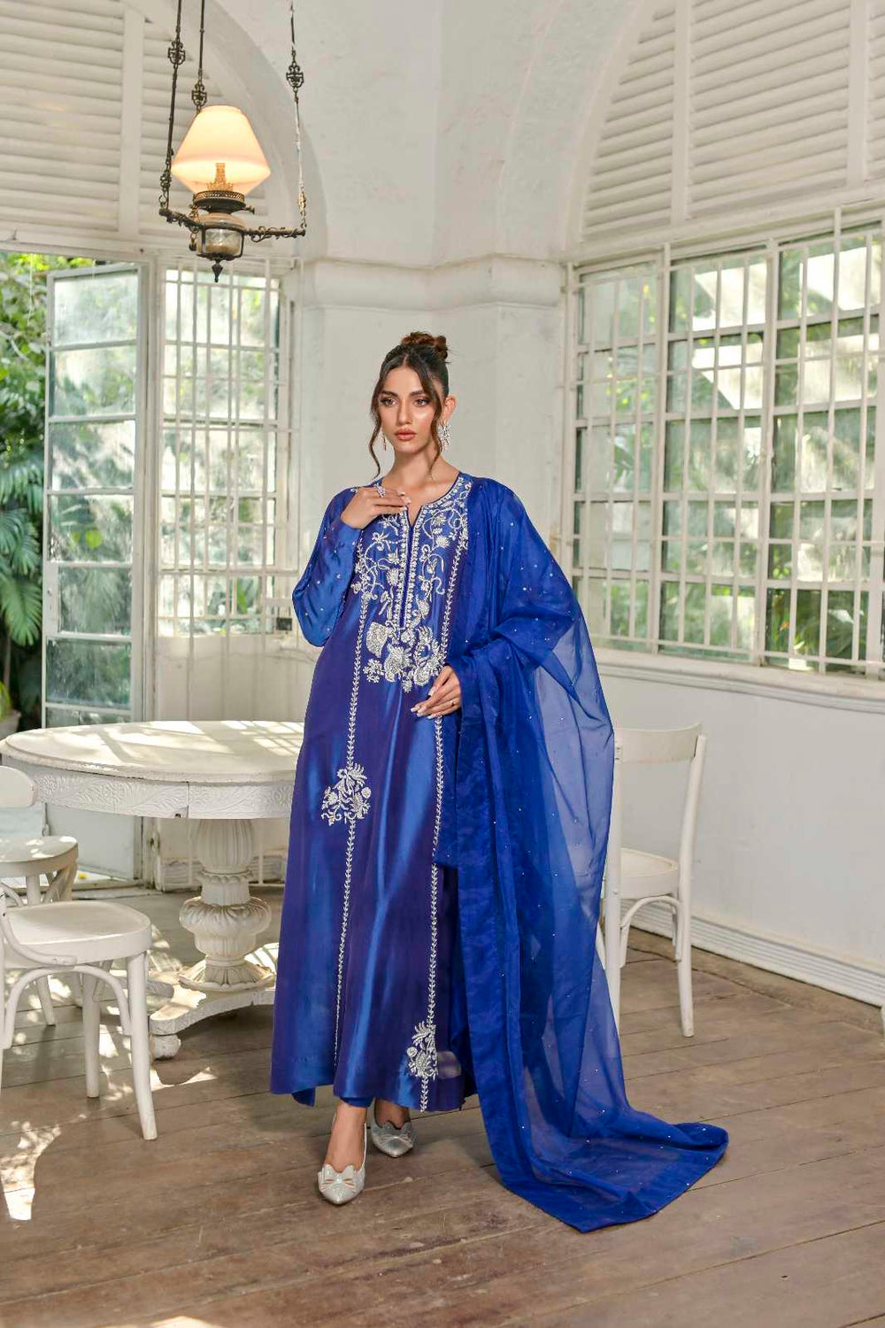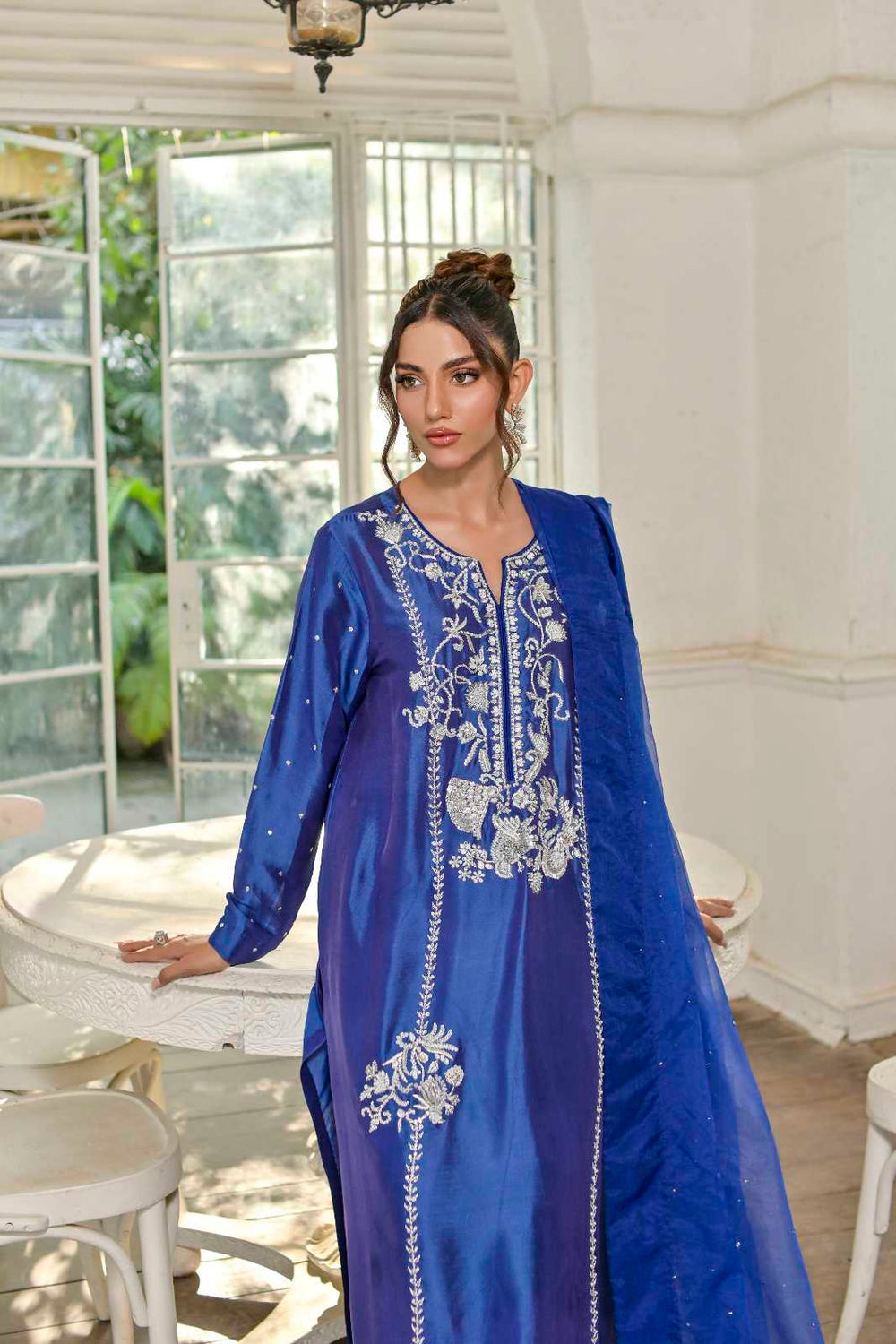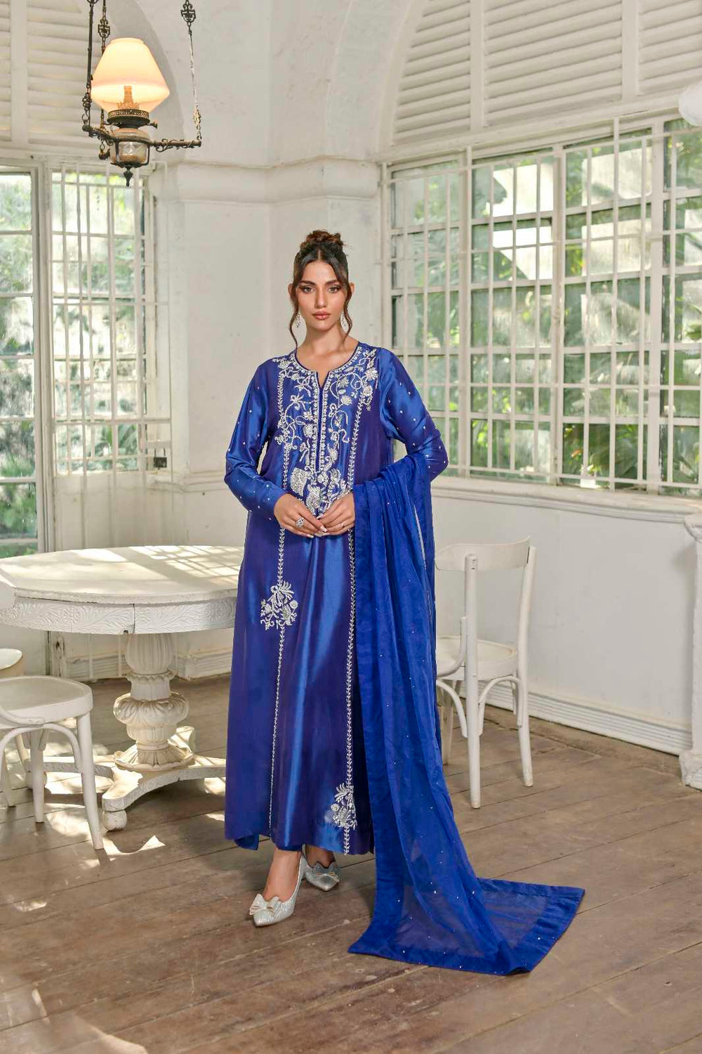 Eshal is a masterpiece of elegance and intricate craftsmanship. The fabric’s soft, reflective sheen adds a luxurious feel, making it ideal for upscale events. The silver hand-embroidered neckline is the focal point of the dress, featuring a blend of exquisite embroidery techniques that give it a rich, textural depth. The sequins work adds a touch of sparkle, catching the light and giving the neckline a glamorous, radiant finish.The combination of sequins, Kora, and Dabka results in a stunning contrast of shimmer and texture, creating a sophisticated yet eye-catching neckline. The long silhouette of the dress flows gracefully, offering a sleek and streamlined look. The length elongates the body, creating a refined and regal appearance. At the bottom, the bunch detailing adds a beautiful, textured accent. This draped bunching creates soft folds and movement, adding an extra layer of dimension to the dress while maintaining its graceful and elegant shape. Overall, this dress balances modern luxury and traditional craftsmanship, with the Sheesha silk fabric providing an ethereal base and the silver hand-embroidery, giving it a rich, festive feel. The long silhouette with bunch detailing adds a refined yet dynamic touch, making it the perfect choice for a wedding, gala, or any...