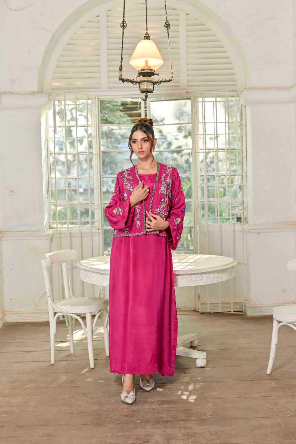 This ensemble features a hand-embroidered Russian silk jacket paired with a flowing long dress, exuding timeless elegance and opulence. The jacket is crafted from luxurious Russian silk, showcasing exquisite, intricate hand-embroidery that could include floral, geometric, or traditional motifs, adding a rich texture and depth to the piece. Its fine craftsmanship and delicate stitching reflect a high level of artistry.