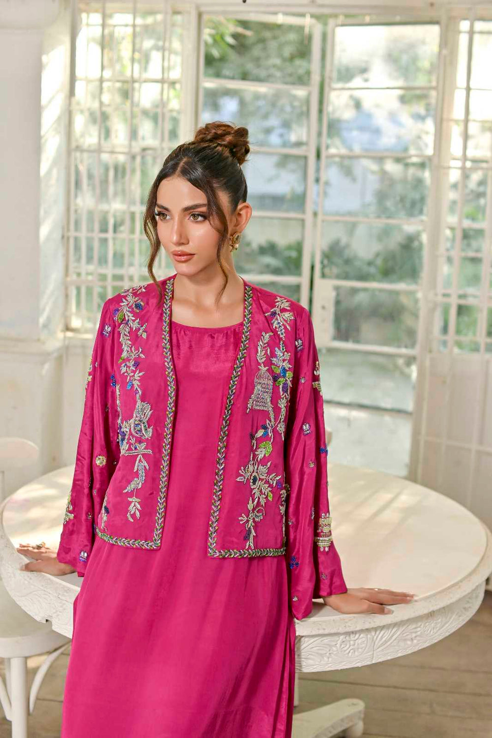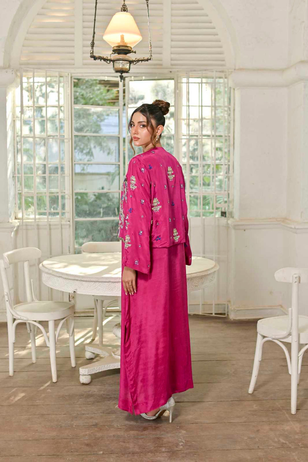 The long dress complements the jacket perfectly, likely in a matching or contrasting fabric, flowing gracefully to the floor. The combination of the two pieces creates a regal, sophisticated look, perfect for a formal event or a special occasion. The silk fabric gives the outfit a soft, glossy finish, while the hand embroidery adds a layer of personalized artistry, making it a true statement piece.