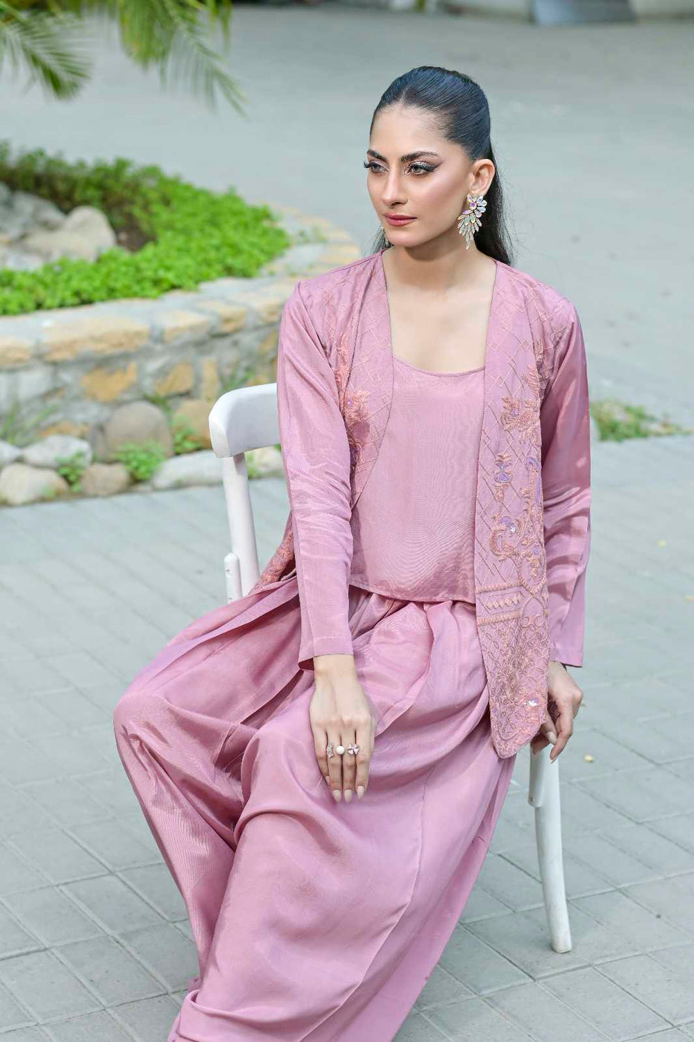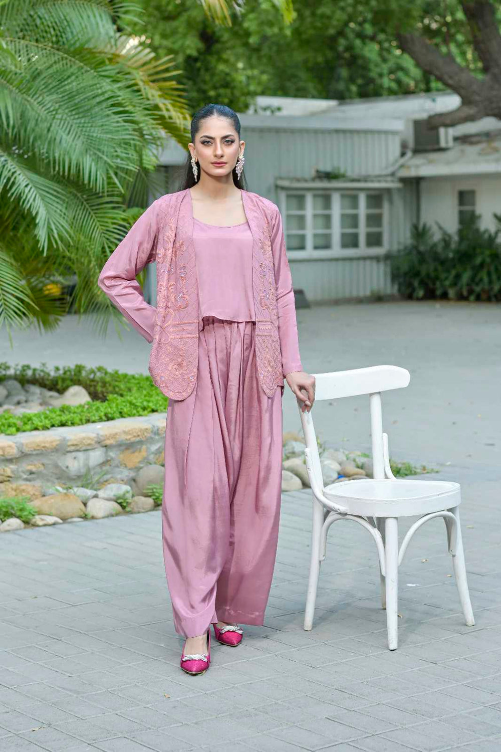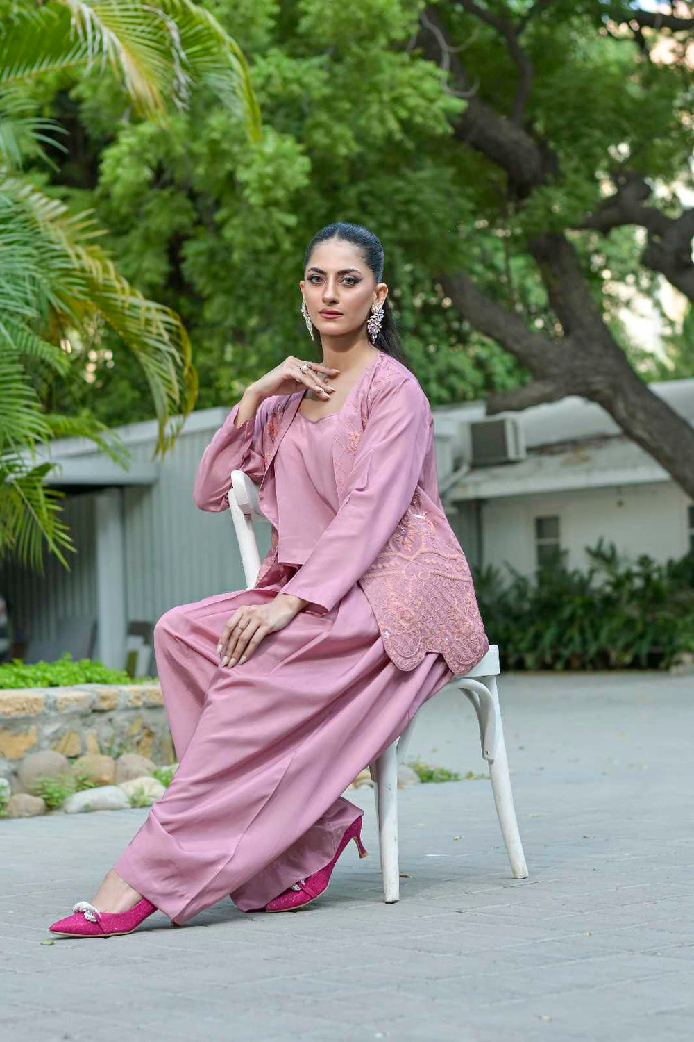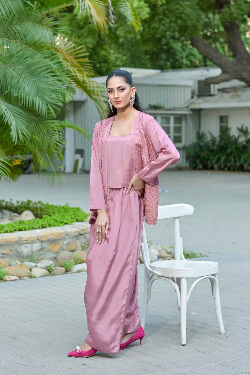 Beneath the jacket, the plain camisole, in the same shade as the jacket, offers a sleek, minimalist look that complements the detailed embroidery of the jacket. The simplicity of the camisole keeps the overall look balanced and refined, allowing the jacket to remain the focal point.