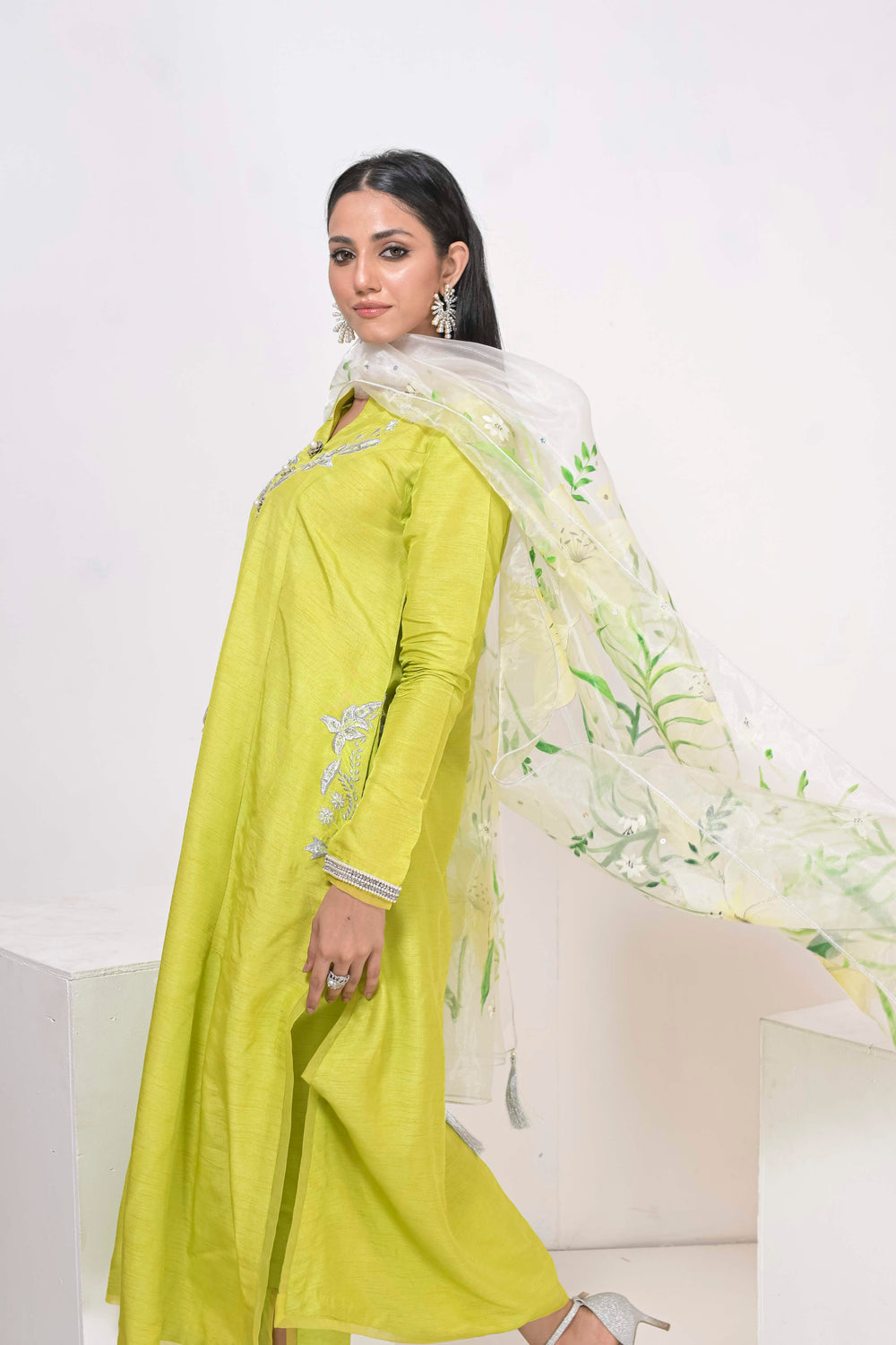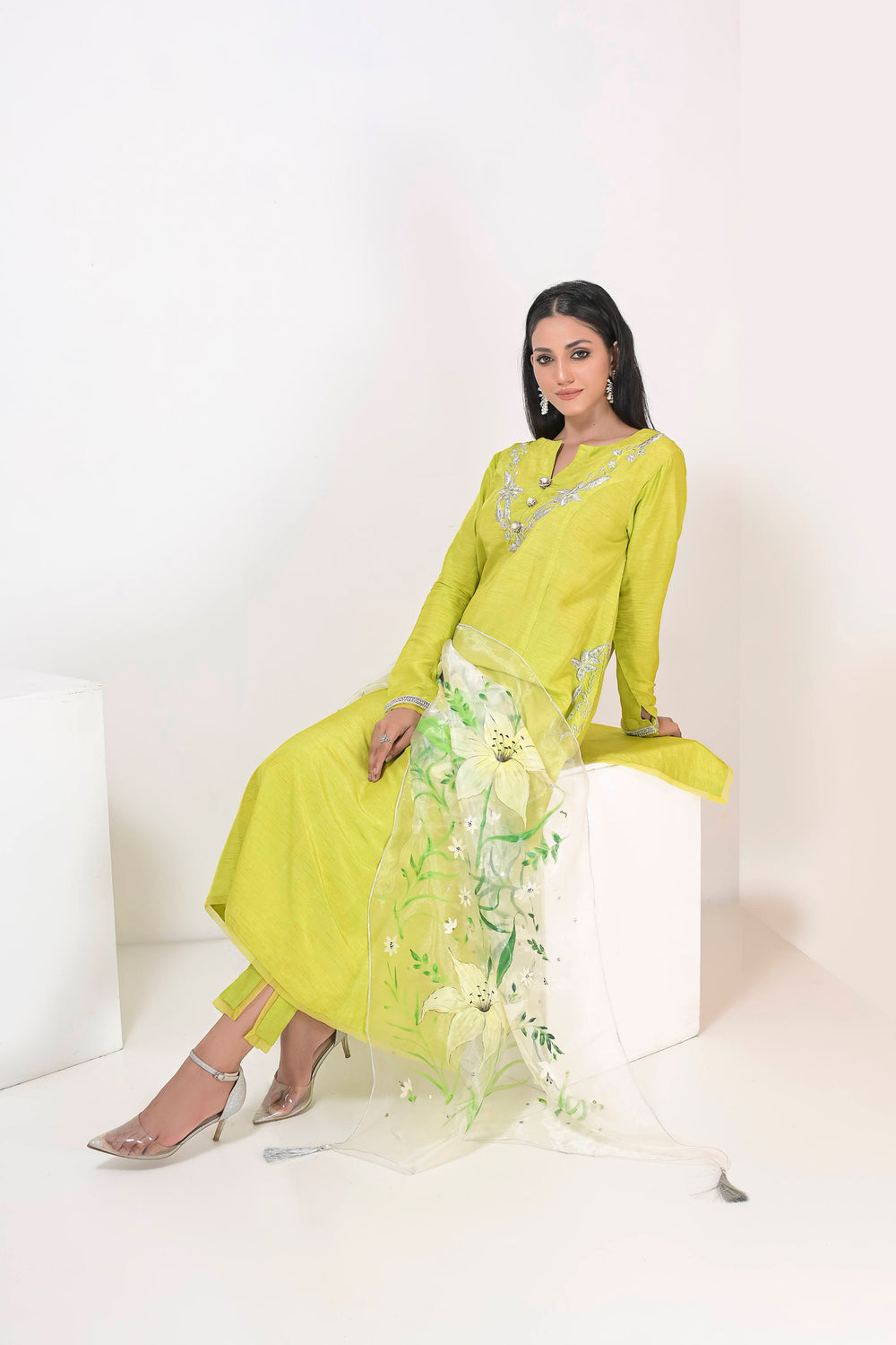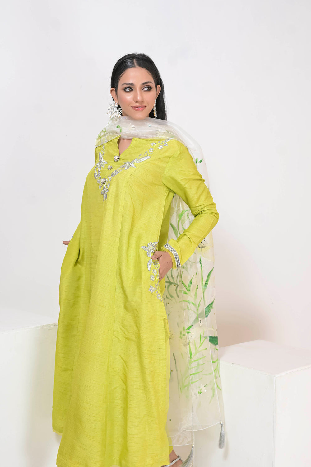 Long Silhouette shirt with embroidery details paired up with straight pants and hand painted dupattas.