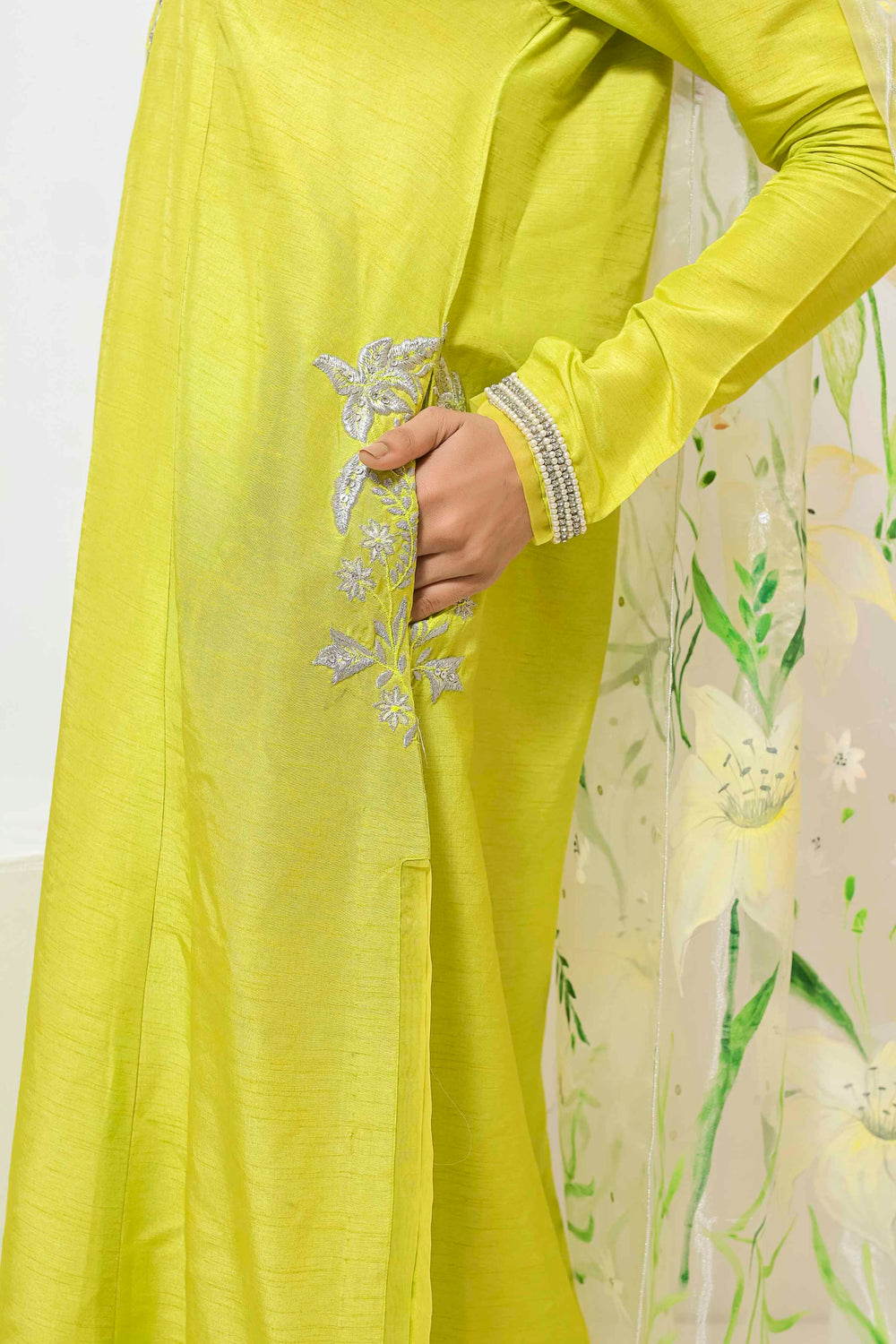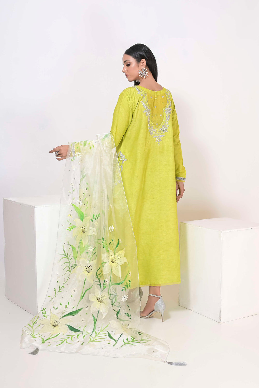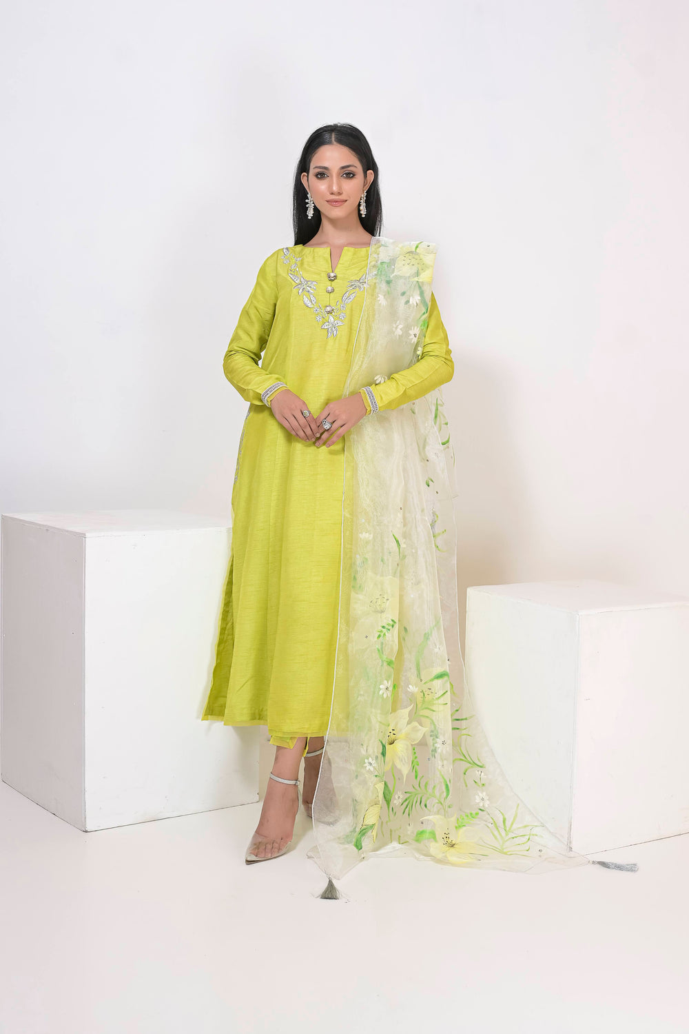 Long Silhouette shirt with embroidery details paired up with straight pants and hand painted dupattas.