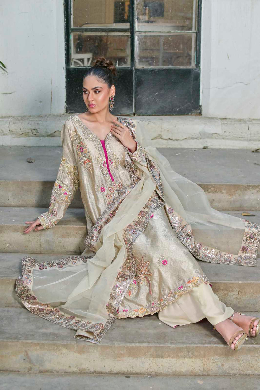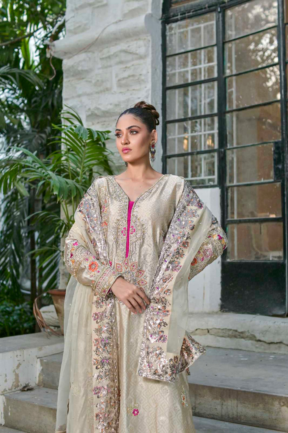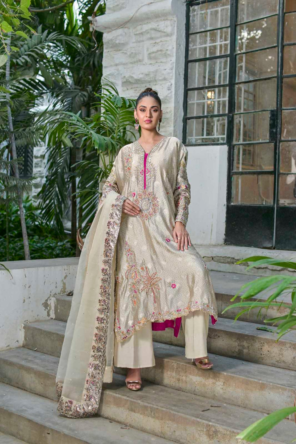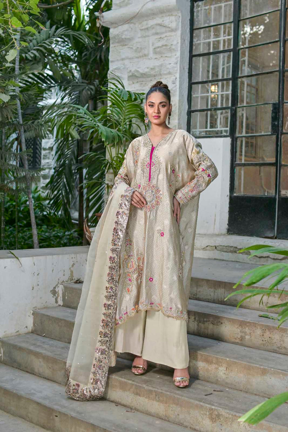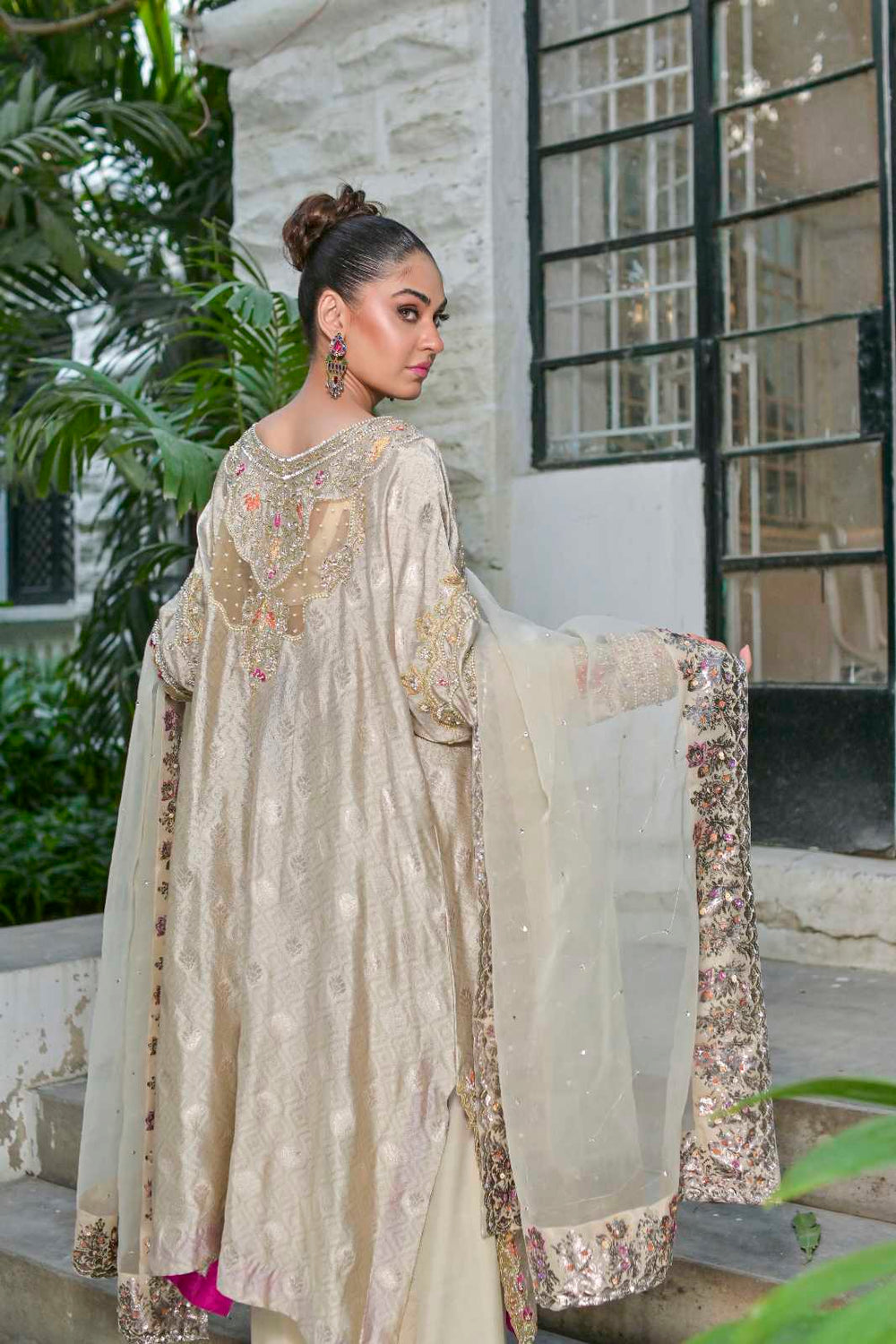 This dress is a stunning fusion of luxury, craftsmanship, and modern elegance. The self-sheesha silk fabric creates a rich, soft sheen, offering a subtle yet sophisticated texture. Sheesha silk, often characterized by its reflective surface, gives the dress a beautiful, understated shine that catches the light in the most elegant way. The dress is adorned with intricate hand embroidery, which could feature detailed floral patterns, geometric designs, or traditional motifs, adding a layer of artistry and texture to the fabric. The handwork enhances the overall opulence of the dress, creating a personalized touch that speaks to the skill and time invested in its creation. The back line of the dress is truly the highlight, with a fancy, stylish design that is not only embroidered but also finished with organza at the back. The use of organza adds a delicate, airy finish that contrasts beautifully with the rich silk, making the back of the dress as attention-grabbing as the front. Whether it’s a dramatic keyhole design, crisscrossed straps, or a plunging back, this feature adds a touch of boldness and modern flair to the dress. Paired with the dress is a handworked and screen-printed dupatta, which complements the outfit’s intricate detailing....