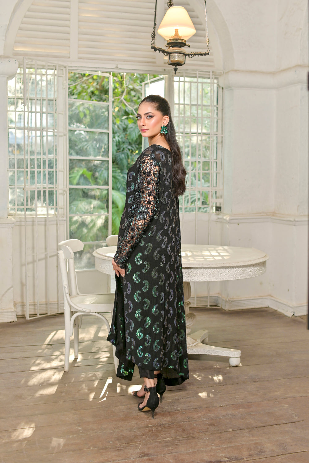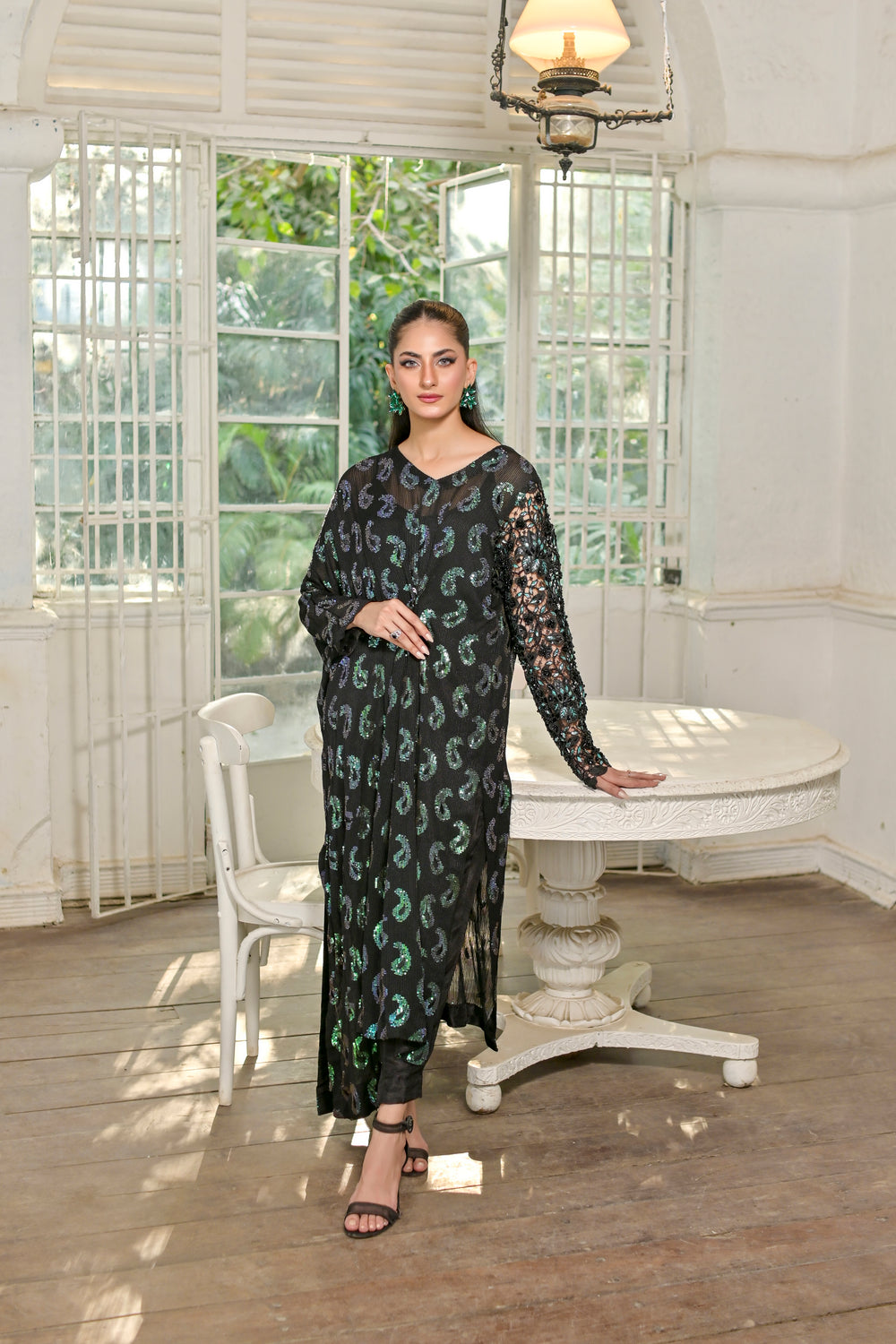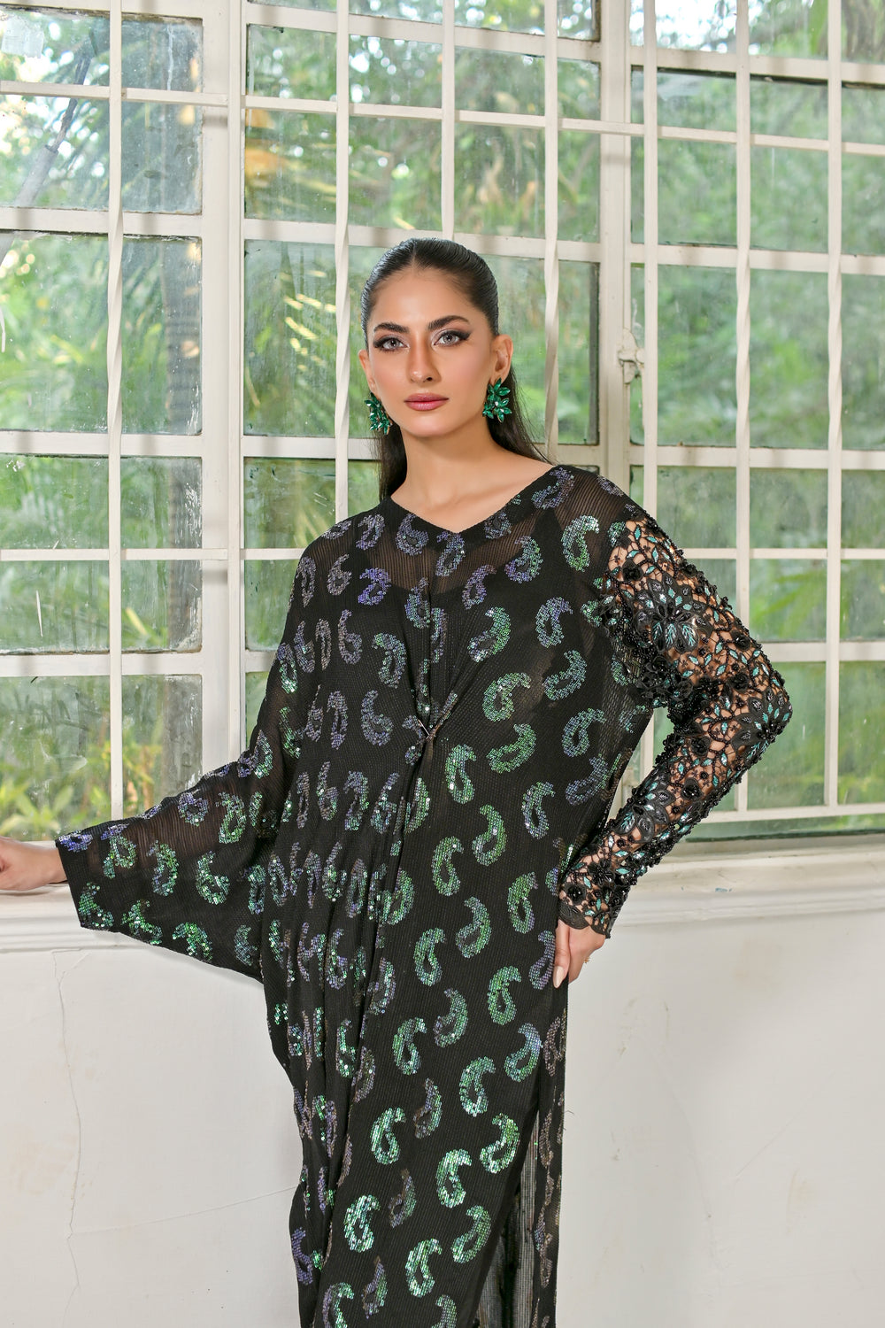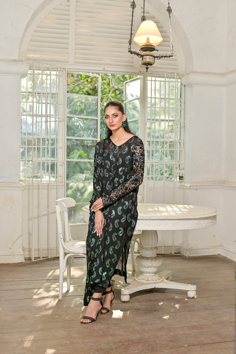 This striking outfit features a bold black fabric adorned with dual-shaded sequins embroidery, creating a dazzling, multi-dimensional effect. One side of the garment is enhanced with net sleeves, adding an airy, elegant touch, beautifully adorned with intricate leather appliqué, offering a modern, edgy contrast. The handwork, using various techniques, adds depth and texture to the overall design, making this ensemble a perfect blend of sophistication and contemporary style, ideal for making a statement at any special event.