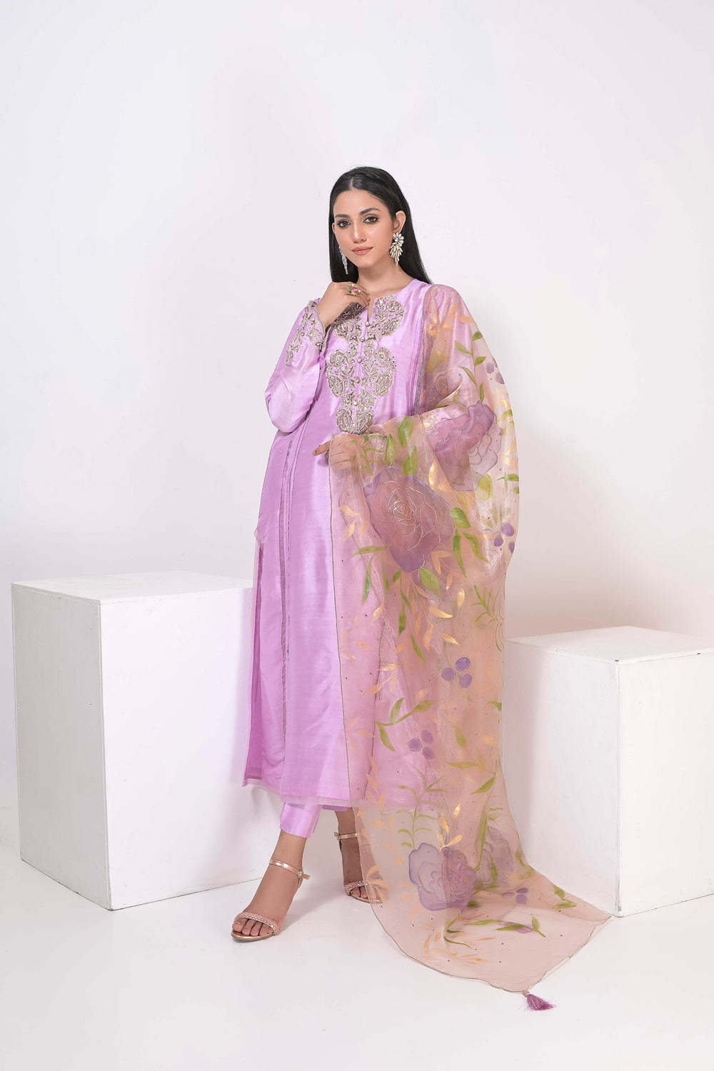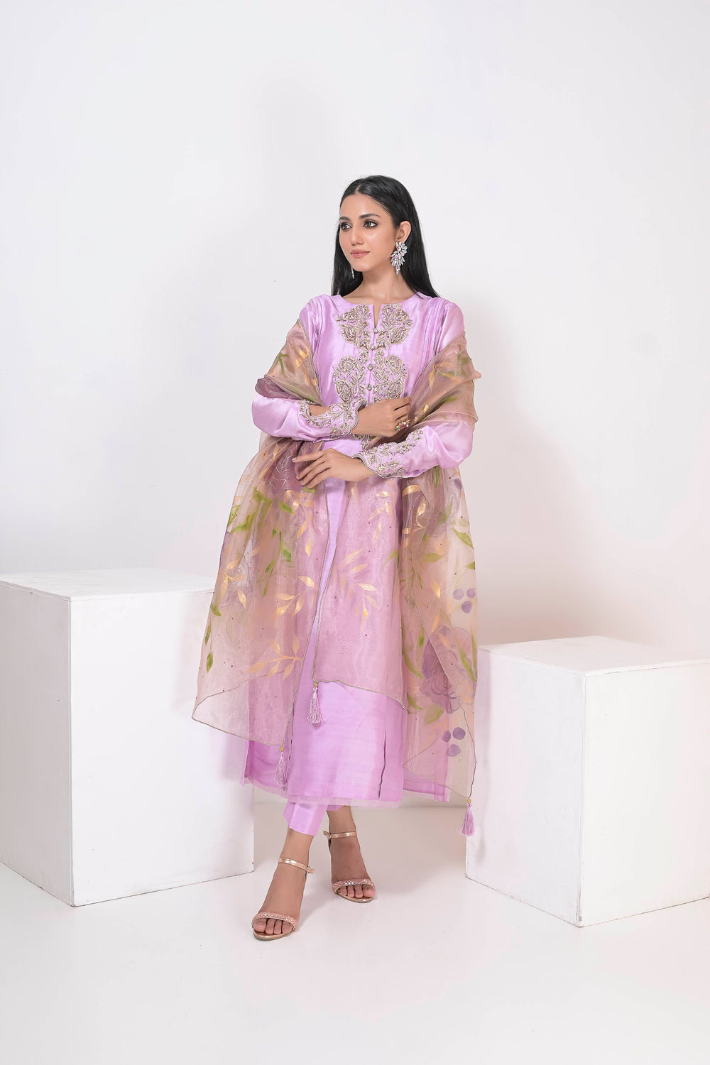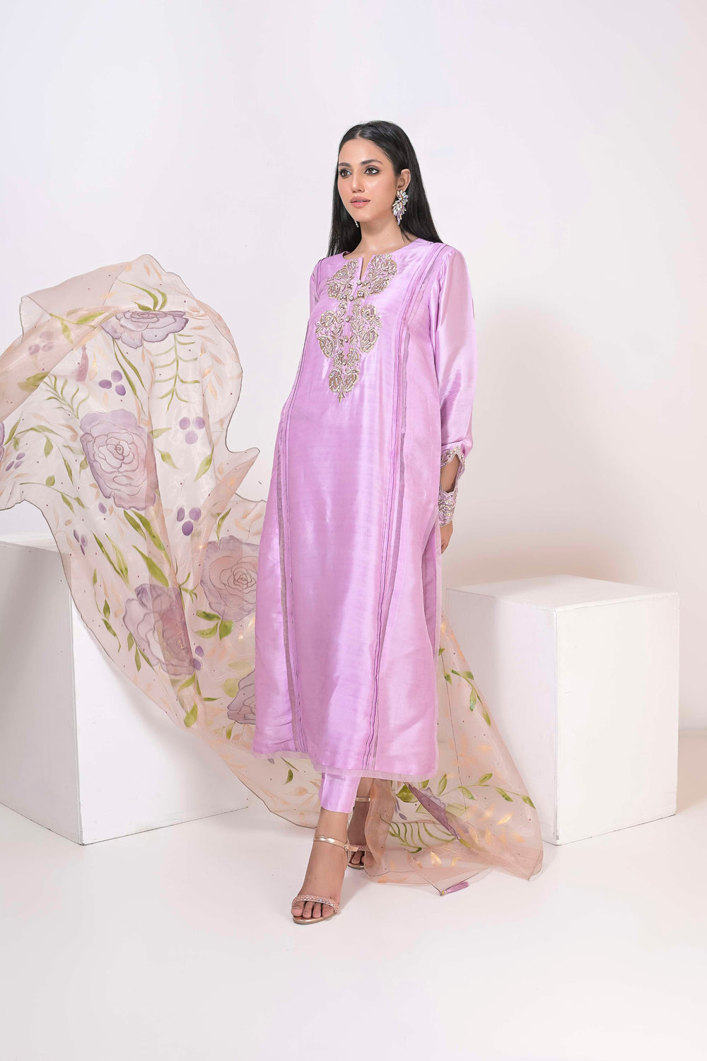 Long Silhouette shirt with embroidery details paired up with straight pants and hand painted dupattas.