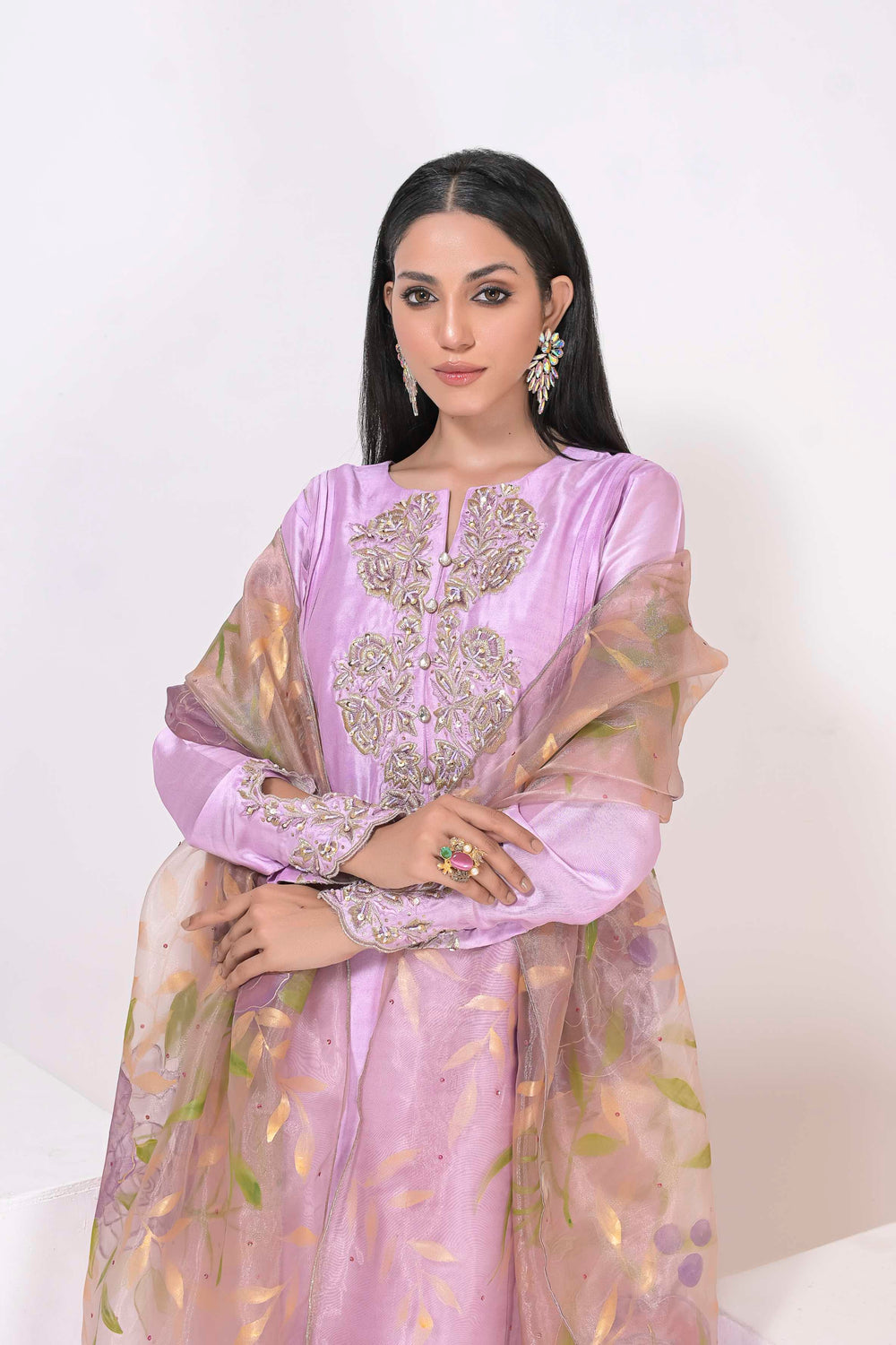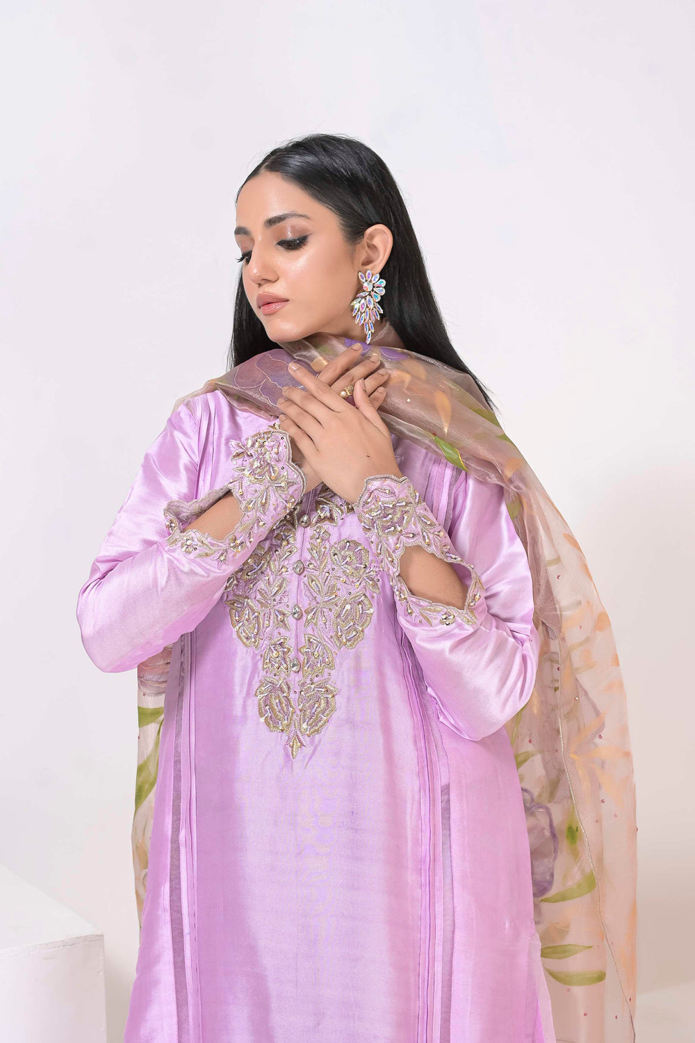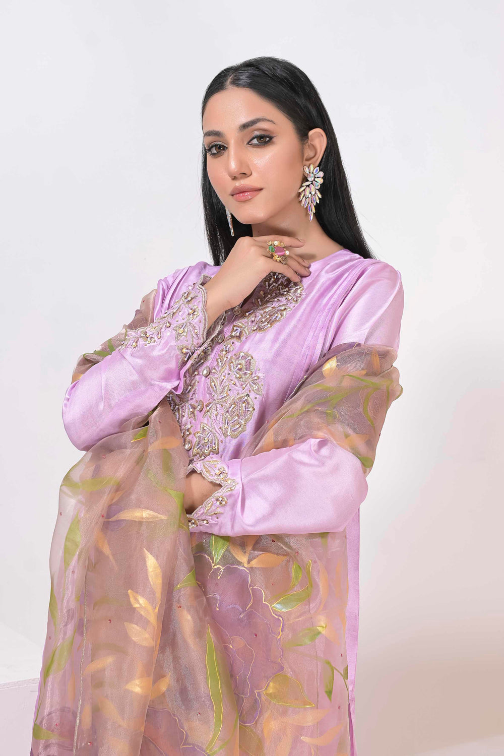 Long Silhouette shirt with embroidery details paired up with straight pants and hand painted dupattas.